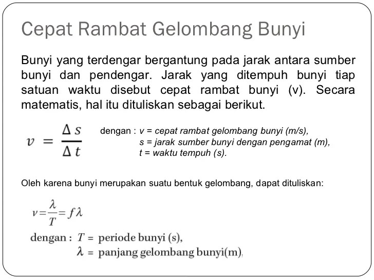 Anda tentu masih ingat rumus kecepatan v = s / t , di mana v = kecepatan, s = jarak tempuh dan t = selang waktu. Jika yang diketahui frekuensi (f), panjang gelombang (λ), atau periode (t), gunakan rumus di bawah ini:. Rumus cepat rambat gelombang transversal · λ = v x t atau λ = v / f · maka : Berapakah kecepatan rambat gelombang tersebut? Cepat rambat bunyi di dalam zat padat.